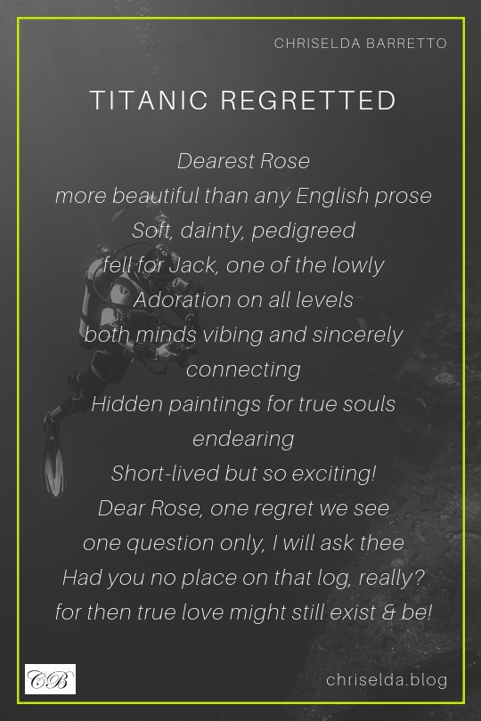 Posted on Sep 15, 2018Jul 30, 2019 by Chriselda BarrettoTitanic Regretted! Share this: Click to share on X (Opens in new window) X Click to share on Facebook (Opens in new window) Facebook Like Loading... Related