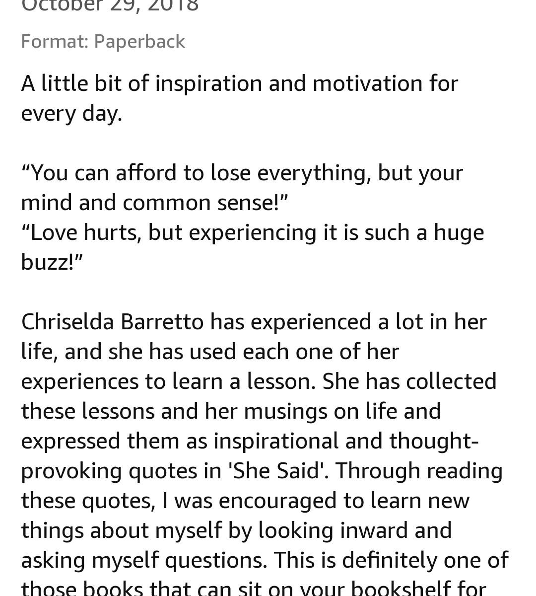 This book is short and concise, the poetic lines are not lengthy but are rightfully brief and simple. It is written in a sort of way by Barretto to probably let each line rhyme and go smoothly with each other as a whole in order to be read poetically by avid readers of poetry books. I found no faults within this book except that to the amateur poetry reader, he or she may find the rhythm to be off-putting but as a poet myself, I can say that it is for the words’ syllables and consonants to flow rhythmically. I finished this book in two days but could have been shorter if I wasn’t too tired from the Halloween craze of two days ago.