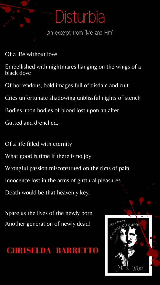 Of a life without love Embellished with nightmares hanging on the wings of a black dove Of horrendous, bold images full of disdain and cult Cries unfortunate shadowing unblissful nights of stench Bodies upon bodies of blood lost upon an alter Gutted and drenched.